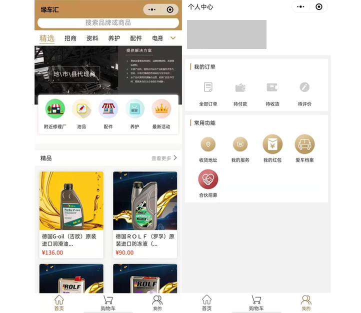 缘车汇小程序包含了商品购买、店家活动、红包、爱车档案、汽车修理资料、招商、检索合作修理厂等基础内容。